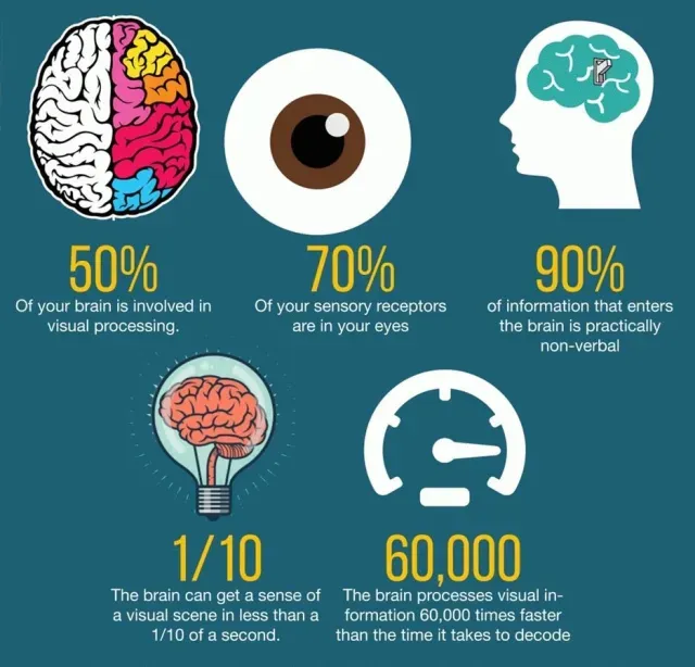 Visuals present complex information in a simplified way and enhance the learner's attention and comprehension by providing context for the content. They also help learners connect to stories and experiences better as they provide crucial context and relevance that text alone cannot provide. In addition to it, visuals create positive emotions like curiosity, amusement, and engagement which make learning more enjoyable. Using visuals helps make content more memorable which leads to higher chances of success in learning outcomes overall.