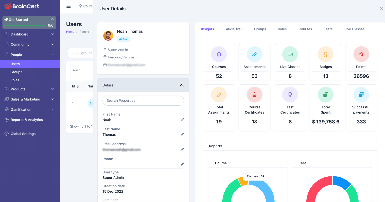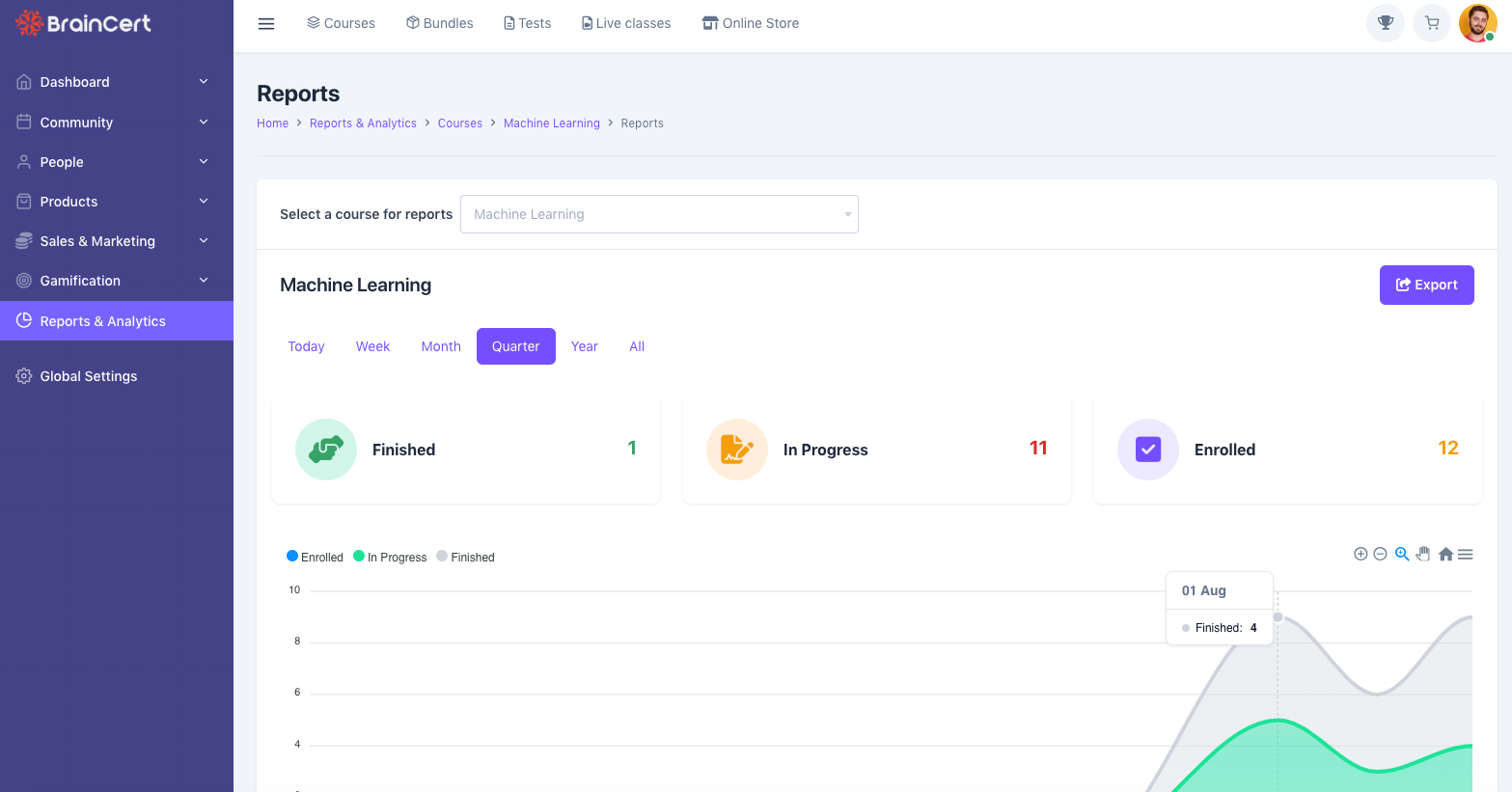 Managing reports and analytics is now a breeze with centralized reporting. BrainCert 2.0 introduces global reports and analytics that allow you to oversee all Learning Management System (LMS) ecosystem reports in one place. This centralized approach simplifies the management of your educational resources.
