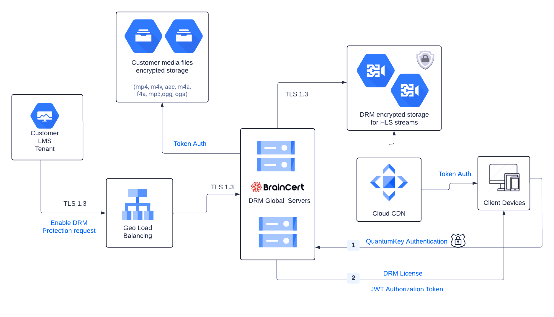 - DRM servers are responsible for encrypting video files on the fly as they are pulled from customer repositories. This ensures that content is protected during both transmission and storage.