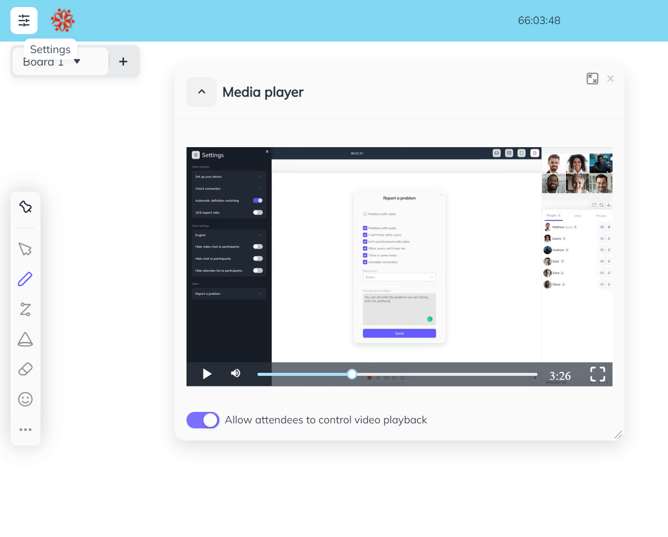 This tool helps to play video over the whiteboard area. You can either copy paste the video link and click on play or play videos from content library.