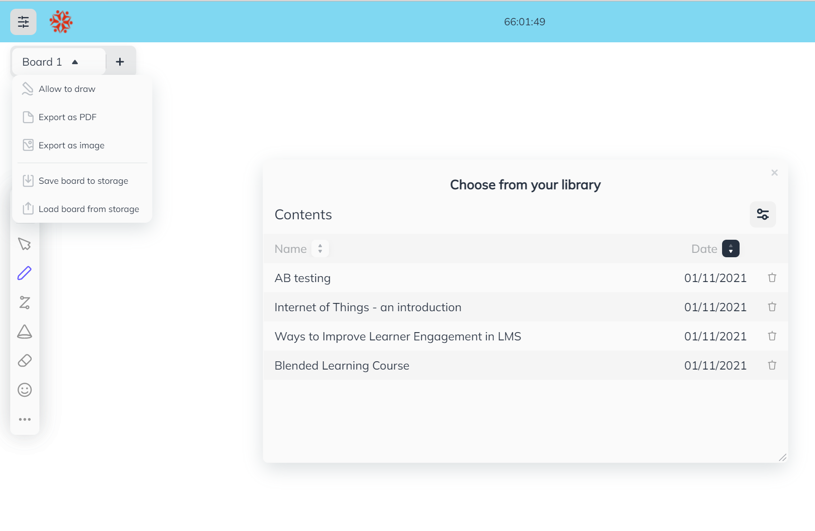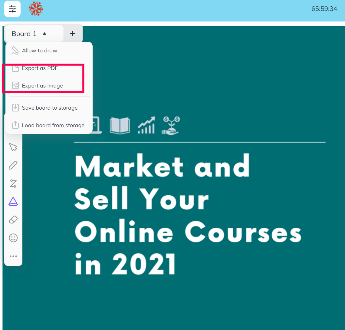 You have an option to save the specific whiteboard tab to cloud storage and load it in any whiteboard tab and in any live class session. This is a great way to quickly show the whiteboard tab without repeating the same content again in another class.