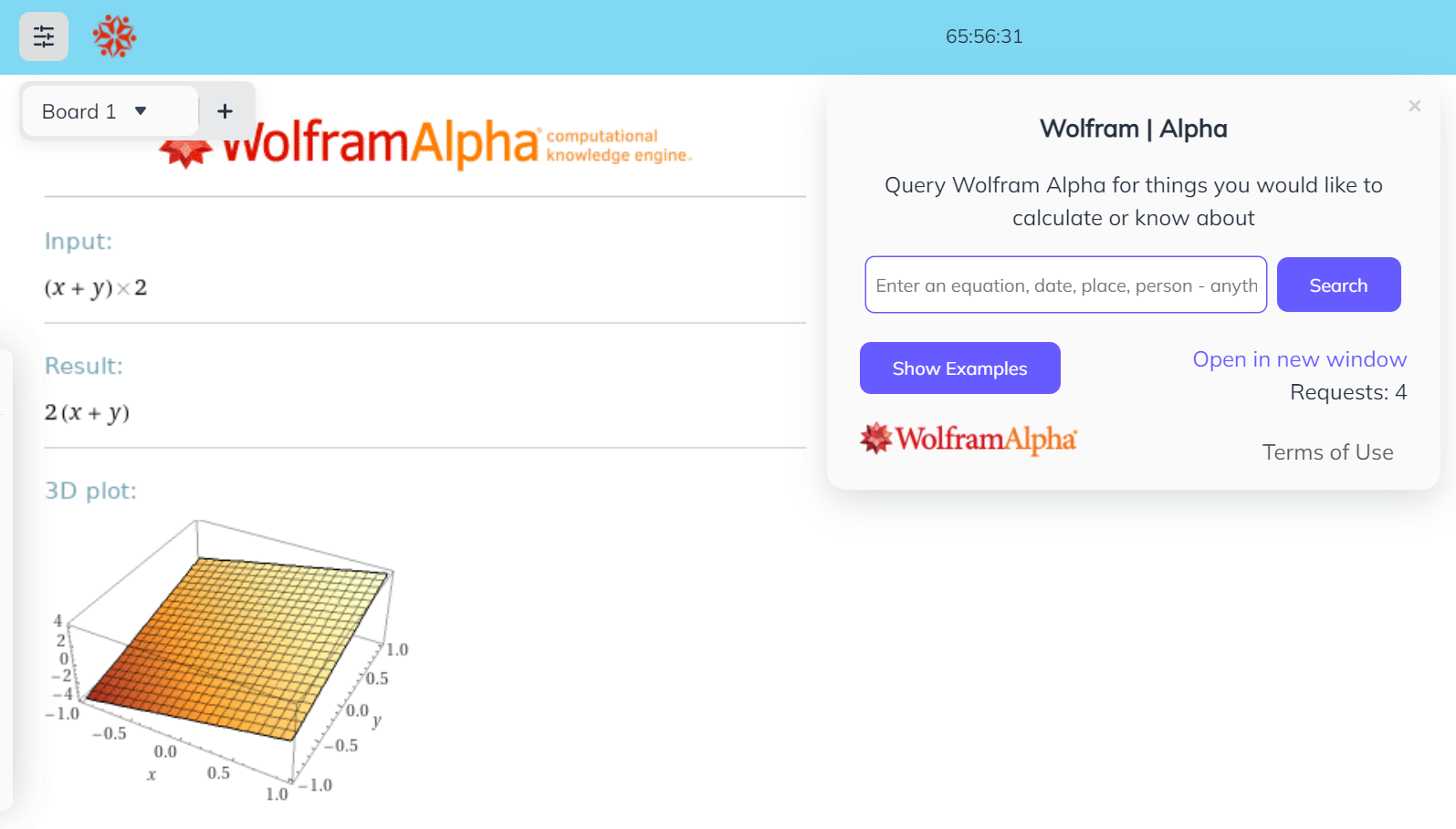 Wolfram|Alpha gives you access to the world's facts and data and calculates answers across a range of topics, including science, nutrition, history, geography, engineering, mathematics, linguistics, sports, finance, music... all right inside the whiteboard.