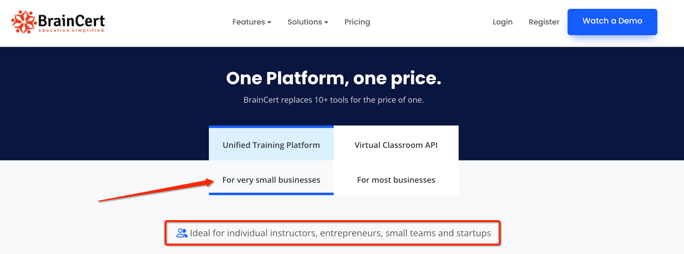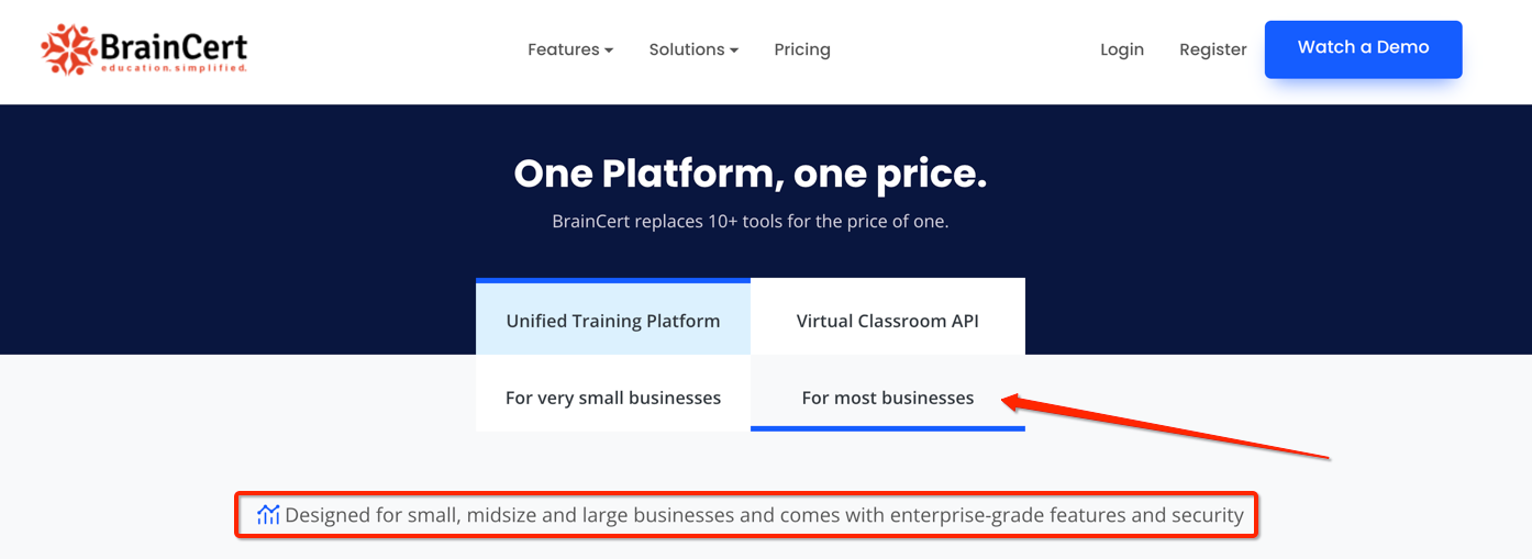 BrainCert is a SaaS all-in-one Unified Training Platform™ designed to deliver any type of training online such as delivering self-paced blended courses, video conferencing, assessments, proctored exams, compliance training, skills development, customer & partner training, and real-time collaboration using an integrated virtual classroom.