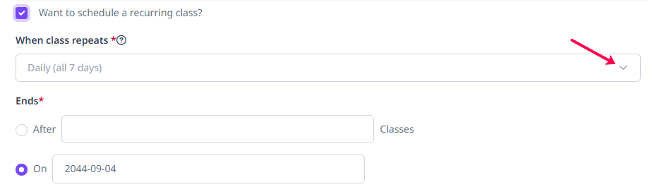 'Recurring classes' is a powerful feature to schedule your live classes that repeats daily, weekly, or monthly. We have introduced a weekly scheduler for your classes that can repeat on a selected day of the week automatically.