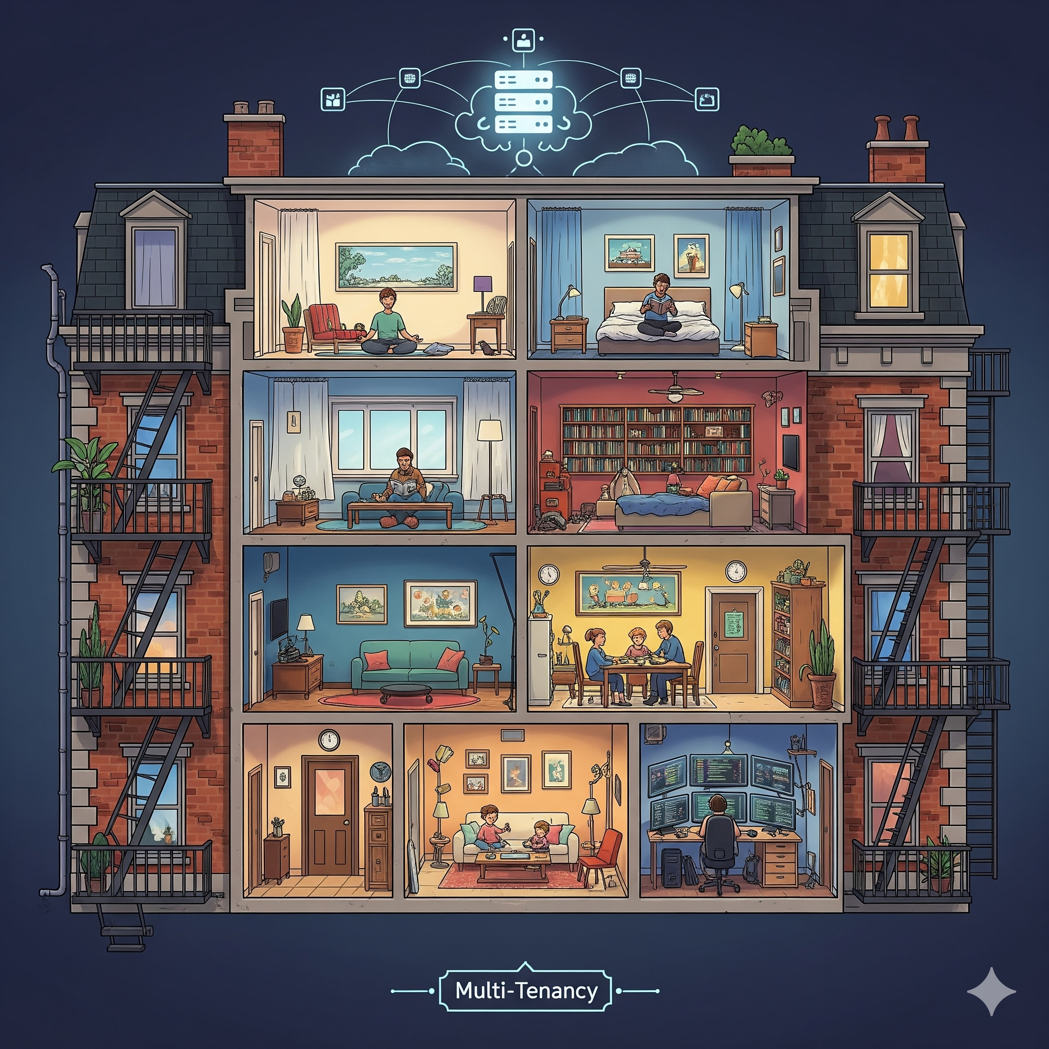Multi-tenancy might sound technical, but it’s actually a pretty intuitive idea once you break it down. Let's pick the same example, imagine a big apartment building: everyone lives under the same roof, but each person or family gets their own private home. They share things like elevators and security, but their living spaces and belongings are separate and secure.