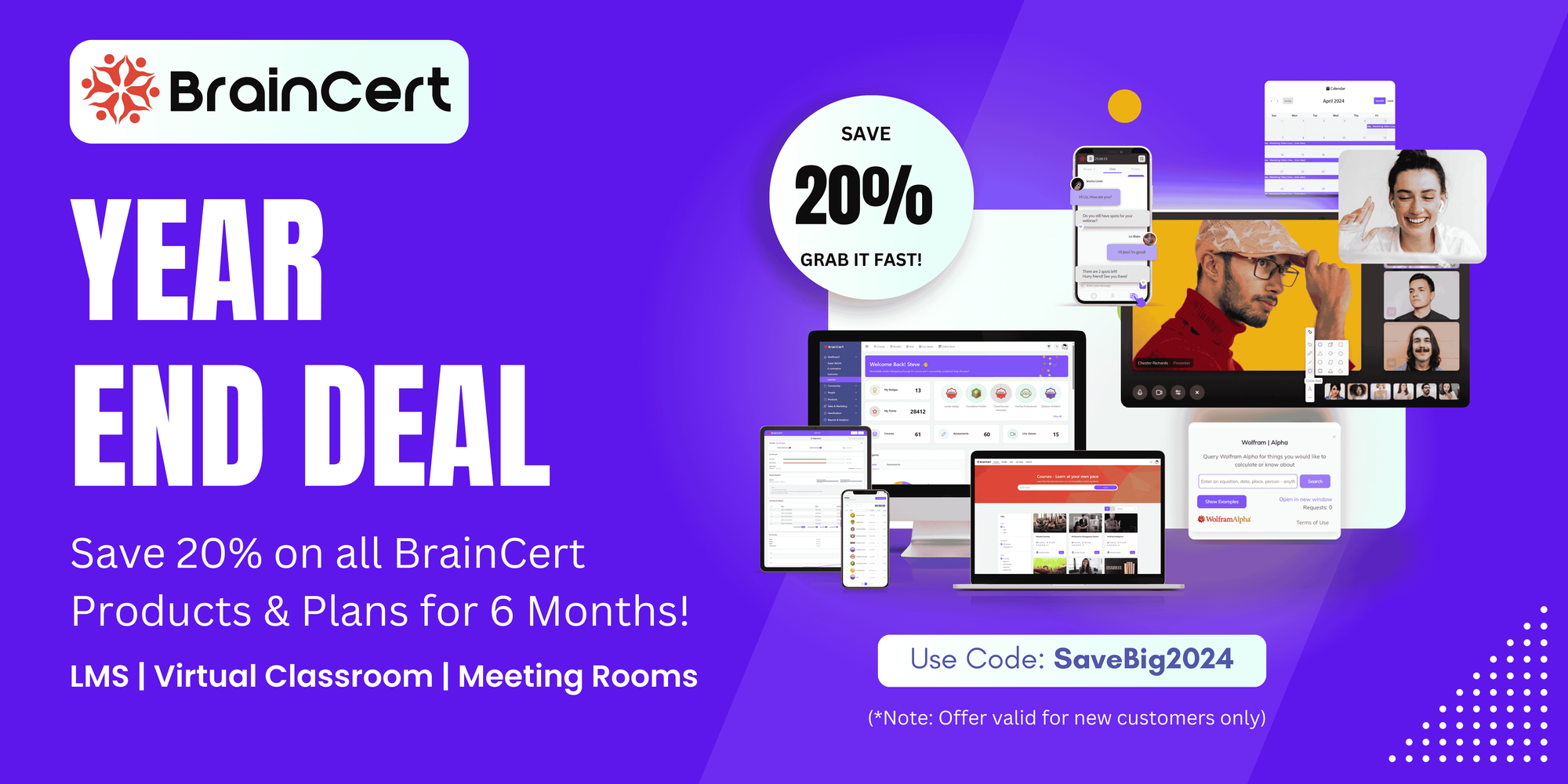 We’re thrilled to announce our Year-End Sale, offering an exclusive limited time, enjoy 20% OFF on All BrainCert Products and Plans. This is the perfect opportunity to unlock premium features, scale your projects, and make 2024 your most successful year yet.